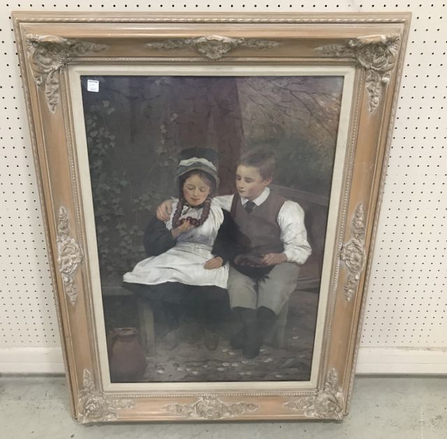 Blonde wood framed print of children sitting on bench, glassed, 47"h., 34"w. Blonde wood framed print of children sitting on bench, glassed, 47"h., 34"w.