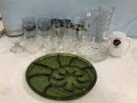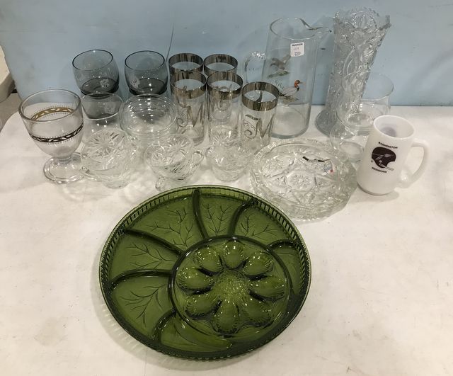 Pressed glass vase, silver rim monogrammed glasses, pressed glass tray, punch cups, NFL cups, Washington Redskins milk glass mugs, green egg tray and serving, duck clear glass water pitcher. Pressed glass vase, silver rim monogrammed glasses, pressed glass tray, punch cups, NFL cups, Washington Redskins milk glass mugs, green egg tray and serving, duck clear glass water pitcher.