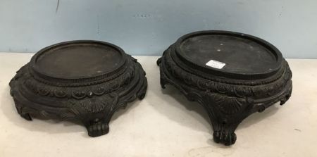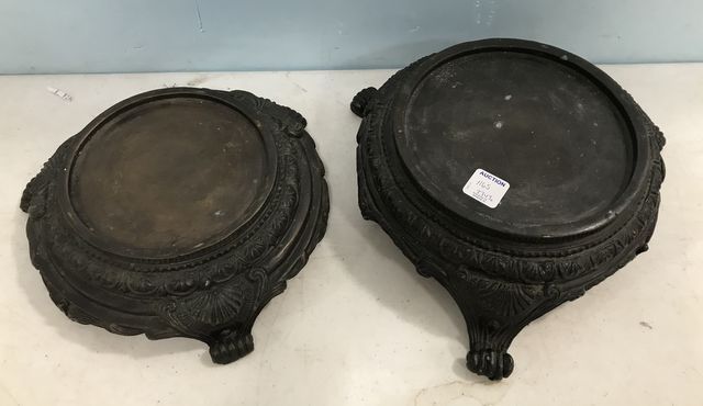 Two Ornate Metal Oriental Style Stands, dark patina, made in Thailand, largest is 3"h., 11"w. Two Ornate Metal Oriental Style Stands, dark patina, made in Thailand, largest is 3"h., 11"w.