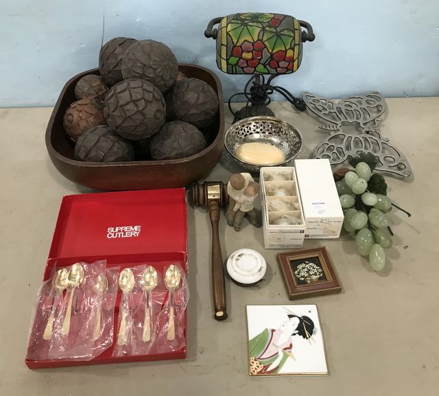 Carved wood bowl and carved decorative balls, replica mini color glass lamp, butterfly metal trivet, Noritake painted Geisha, small painted still life by S.B.V, silver plated napkin rings, grapes, Supreme Cutlery spoons, judge gavel. Carved wood bowl and carved decorative balls, replica mini color glass lamp, butterfly metal trivet, Noritake painted Geisha, small painted still life by S.B.V, silver plated napkin rings, grapes, Supreme Cutlery spoons, judge gavel.