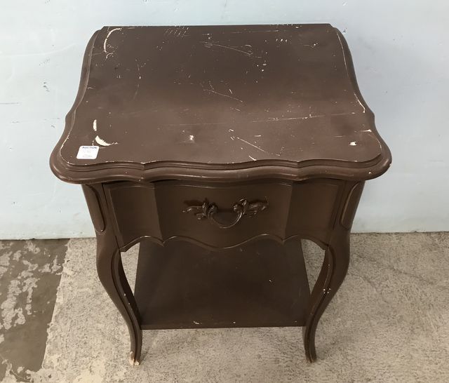 Painted French Style Single Drawer Nightstand, two tier, single drawer (hardware needs one screw), has wear on painted finish, 24"h., 18"d. Painted French Style Single Drawer Nightstand, two tier, single drawer (hardware needs one screw), has wear on painted finish, 24"h., 18"d.