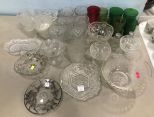 Footed pressed nut bowl, Sandwich custards, green cups, pressed glass dishes, Nut bowl, silver plate inlaid dishes, salt & pepper. Footed pressed nut bowl, Sandwich custards, green cups, pressed glass dishes, Nut bowl, silver plate inlaid dishes, salt & pepper.