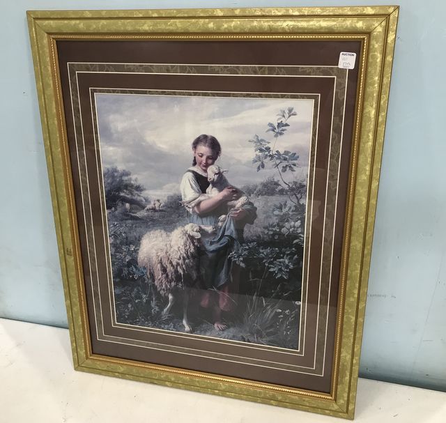 Modern Gold Gilt Framed Girl and Sheep Print, glassed, matted, 32"h., 25"w. Modern Gold Gilt Framed Girl and Sheep Print, glassed, matted, 32"h., 25"w.