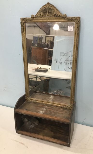 Vintage Rectangular Gold Wall Mirror, with married wood shelf, has wear, 31"h., 14"w. Vintage Rectangular Gold Wall Mirror, with married wood shelf, has wear, 31"h., 14"w.