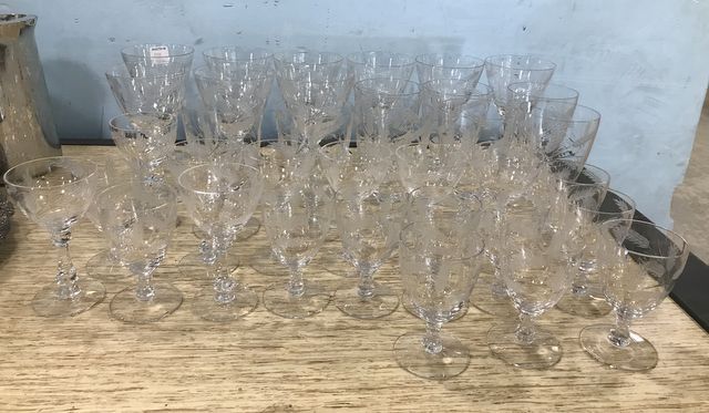 Group of Etched Glass Stemware, etched wheat pattern, clear glass, 36 total. Group of Etched Glass Stemware, etched wheat pattern, clear glass, 36 total.