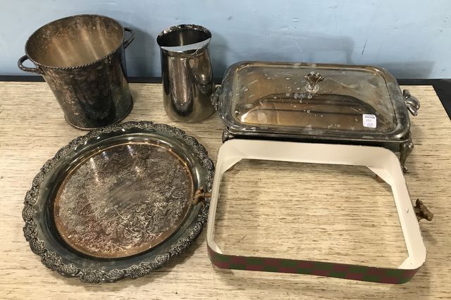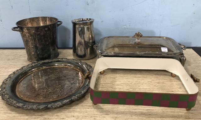 Silver Plate Serving Pieces, casserole dish no glass lining, round tray, ice bucket, pitcher. Silver Plate Serving Pieces, casserole dish no glass lining, round tray, ice bucket, pitcher.