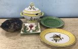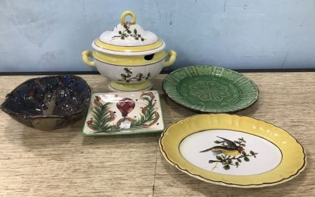 Gail Pittman square plate, signed colorful hand made bowl, stoneware green plate, hand painted porcelain bird platter, and tureen no ladle. Gail Pittman square plate, signed colorful hand made bowl, stoneware green plate, hand painted porcelain bird platter, and tureen no ladle.