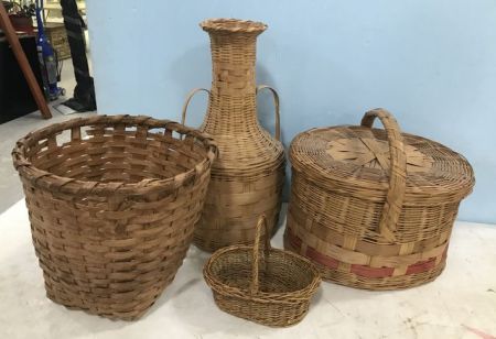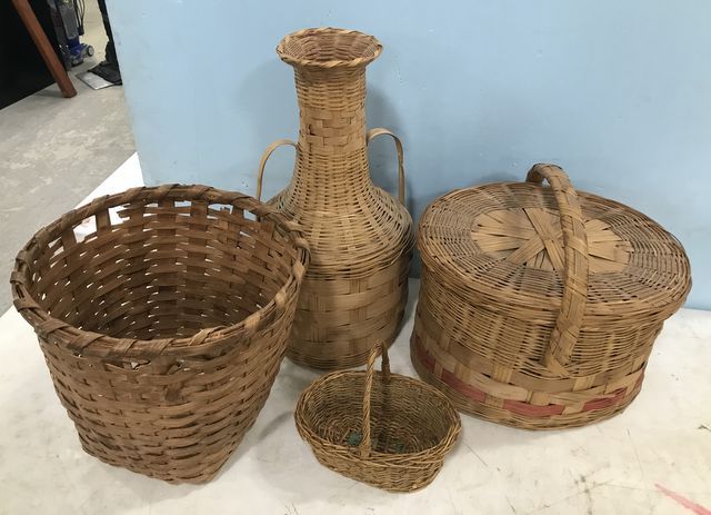 Woven covered basket with handle 12"h., 14"w., woven handled urn basket 20"h., round basket with hole damage and small handled baskets. Woven covered basket with handle 12"h., 14"w., woven handled urn basket 20"h., round basket with hole damage and small handled baskets.