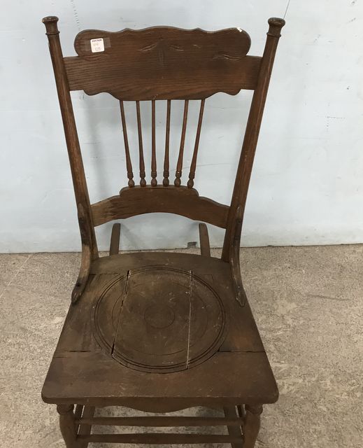 Small sewing rocker with leather seat, has splits, and wear, 34"h. Small sewing rocker with leather seat, has splits, and wear, 34"h.