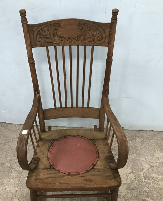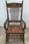 Oak pattern back rocker with seat, has damaged areas, striped, 40"h. Oak pattern back rocker with seat, has damaged areas, striped, 40"h.