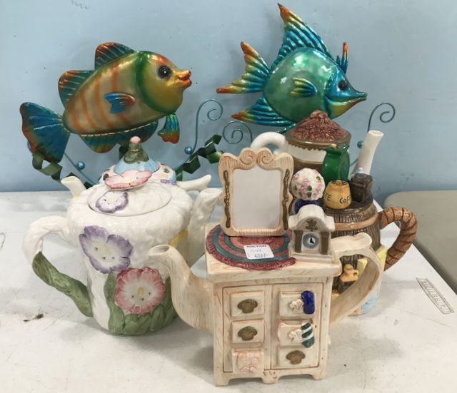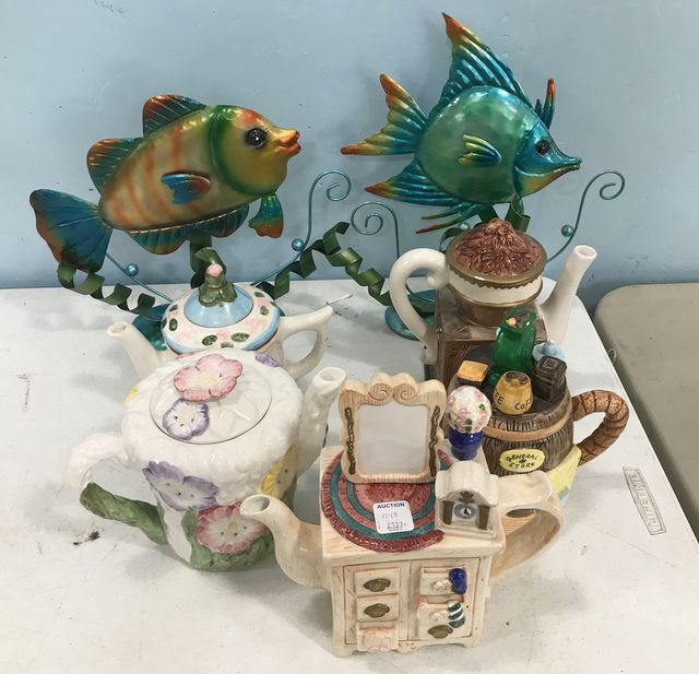 1248 Collection of Hand Painted Ceramic Tea Pots and Metal Art Fish Decor