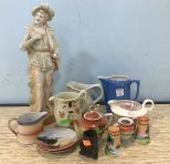Ceramic hand painted French Man Figure 15"h., Japanese mini tea set, German pitcher, Dreamer pitcher, Hall pottery pitcher, small vase, Edwin Knowles creamer. Ceramic hand painted French Man Figure 15"h., Japanese mini tea set, German pitcher, Dreamer pitcher, Hall pottery pitcher, small vase, Edwin Knowles creamer.
