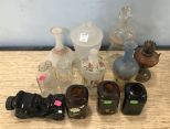 Fenton Garden club jar with lid, medicine bottles, color glass jars, old car decanter, hand painted jar, mini lantern (no shade), etched decanter. Fenton Garden club jar with lid, medicine bottles, color glass jars, old car decanter, hand painted jar, mini lantern (no shade), etched decanter.