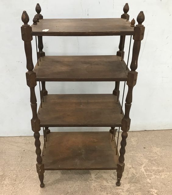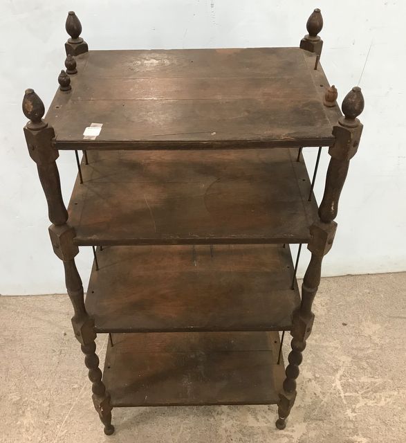 Circa 1870 Four Shelf Spool "Stick and Ball" Music Stand, has condition issues, missing rods and finial, 42"h., 12"d., 21"w. Circa 1870 Four Shelf Spool "Stick and Ball" Music Stand, has condition issues, missing rods and finial, 42"h., 12"d., 21"w.