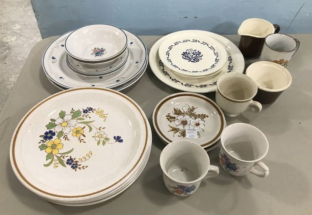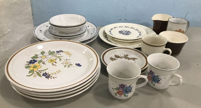 Colorstone dinner plate (4), Provincial Bouquet bowls, dessert plates, 2 dinner plates, ceramic blue and white dinner plate and 2 dessert plates, 6 mugs, 2 Mountain wood collection dessert plates. Colorstone dinner plate (4), Provincial Bouquet bowls, dessert plates, 2 dinner plates, ceramic blue and white dinner plate and 2 dessert plates, 6 mugs, 2 Mountain wood collection dessert plates.