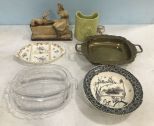 Mid Century Green pottery Rooster lamp, Copeland china bowls, Japan divided dish, Tudor Rose brass tray, chalkware planter, and relish dish Fortoria. Mid Century Green pottery Rooster lamp, Copeland china bowls, Japan divided dish, Tudor Rose brass tray, chalkware planter, and relish dish Fortoria.