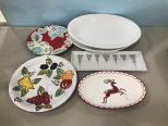 Round serving plates, Christmas tray, platter, and two white ceramic serving divided platter, oval platter. Round serving plates, Christmas tray, platter, and two white ceramic serving divided platter, oval platter.
