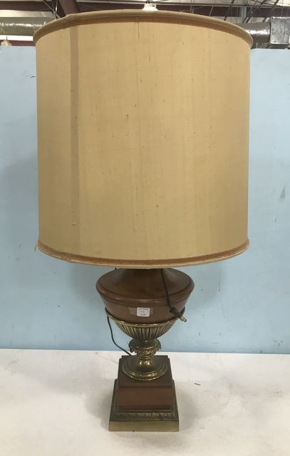 Wood and Brass Urn Table Lamp, vintage, has shade, 33"h. Wood and Brass Urn Table Lamp, vintage, has shade, 33"h.