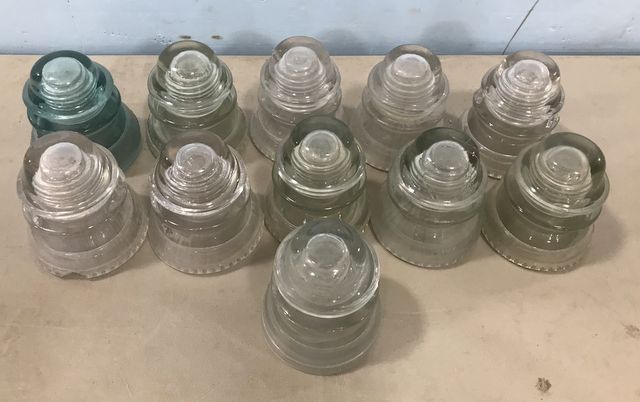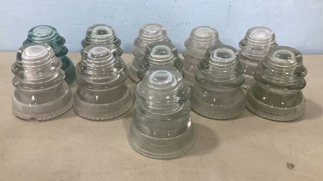 11 total vintage glass insulators, clear glass, 4"h. 11 total vintage glass insulators, clear glass, 4"h.
