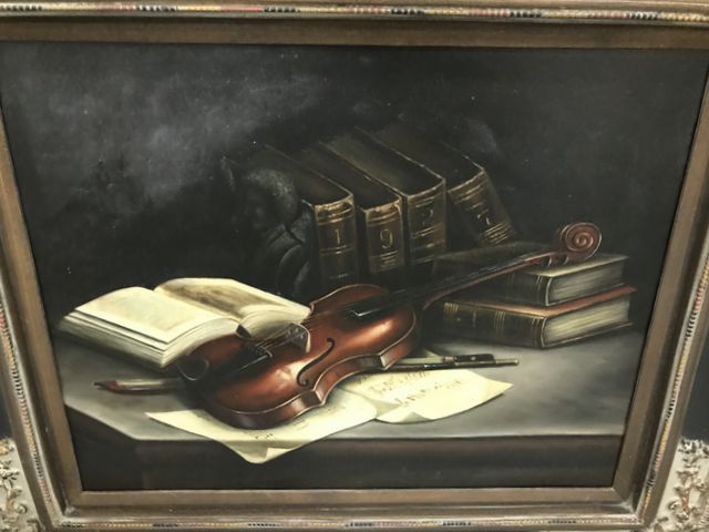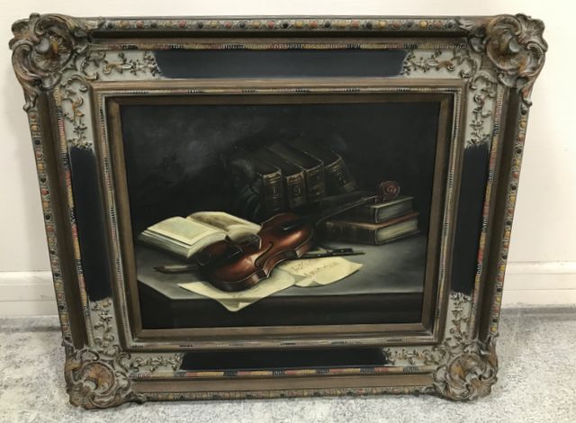 Modern Decor Violin Painting, modern ornate frame, possibly a giclee painting copy, 25"h., 29"w. Modern Decor Violin Painting, modern ornate frame, possibly a giclee painting copy, 25"h., 29"w.