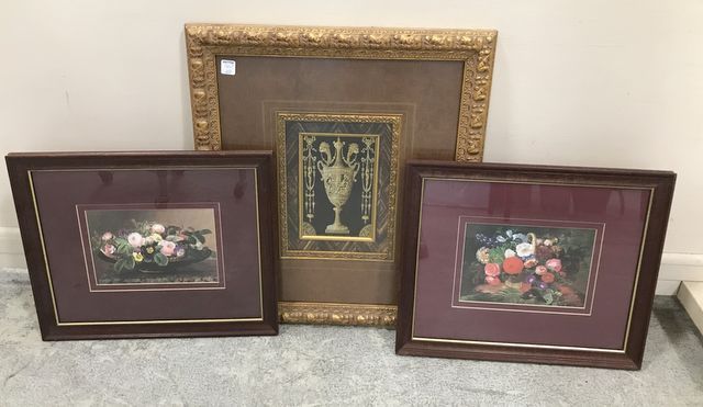 Urn gold gilt framed print 24"h., 21"w., and two still life flower bouquet prints framed. Urn gold gilt framed print 24"h., 21"w., and two still life flower bouquet prints framed.