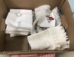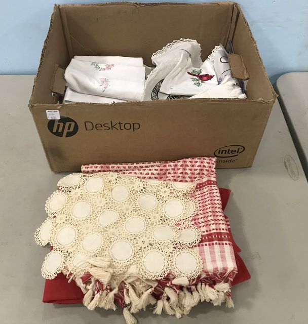 Group of Lines, Napkins, and clothes, pillow cases, crocheted pieces, in box. Group of Lines, Napkins, and clothes, pillow cases, crocheted pieces, in box.