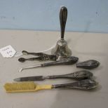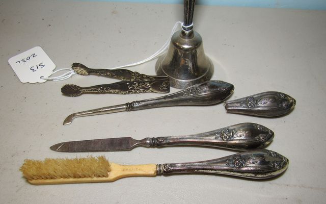 Sterling handle bell, brush, file, pick, sterling tong. Sterling handle bell, brush, file, pick, sterling tong.