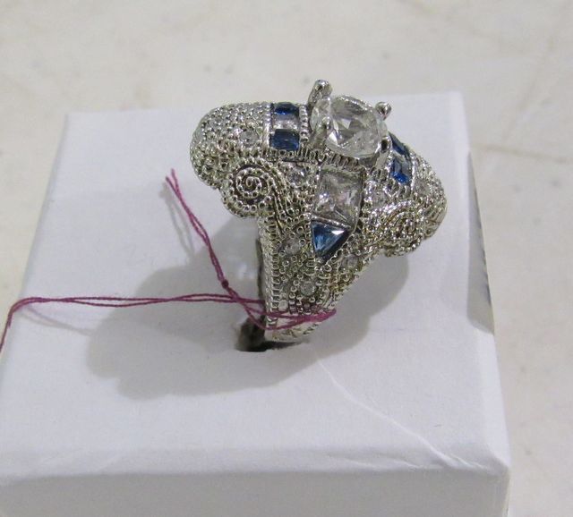Blue and clear stones, fancy mounting, size 7. Blue and clear stones, fancy mounting, size 7.