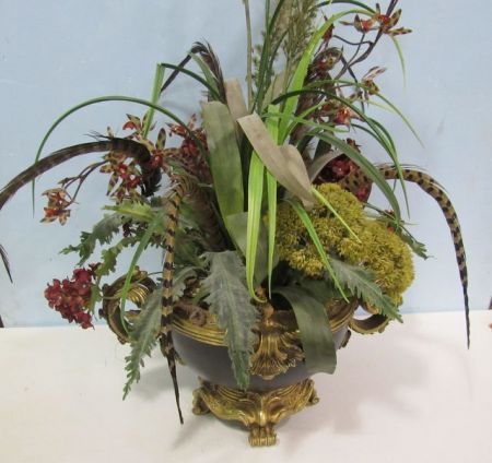 ornate gold design, artificial flowers., urn Measures 11"h., 20"w. ornate gold design, artificial flowers., urn Measures 11"h., 20"w.