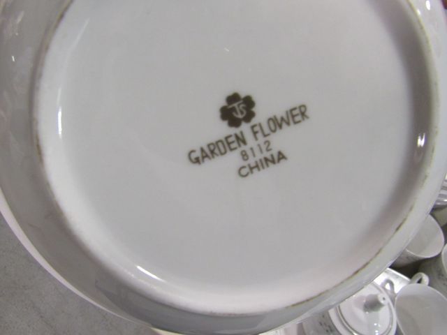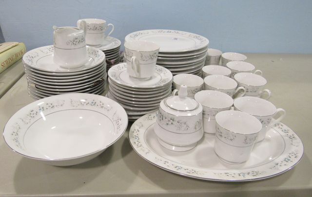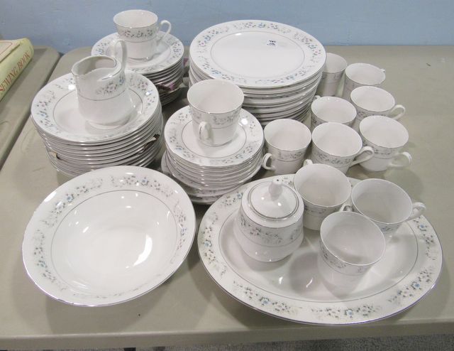 12 Dinner plates, 12 salad plates, 12 bowls, serving bowl, 11 dessert plates, 12 cups, creamer, sugar, serving platter. 12 Dinner plates, 12 salad plates, 12 bowls, serving bowl, 11 dessert plates, 12 cups, creamer, sugar, serving platter.