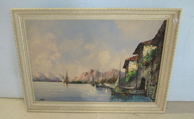 951 Oil Painting of Canvas Boats in Harbor