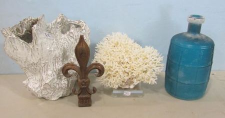 963 Frosted Jar, Fleur-de-lis Gate Emblem, Coral Birds Nest, and Pottery Stump Vase