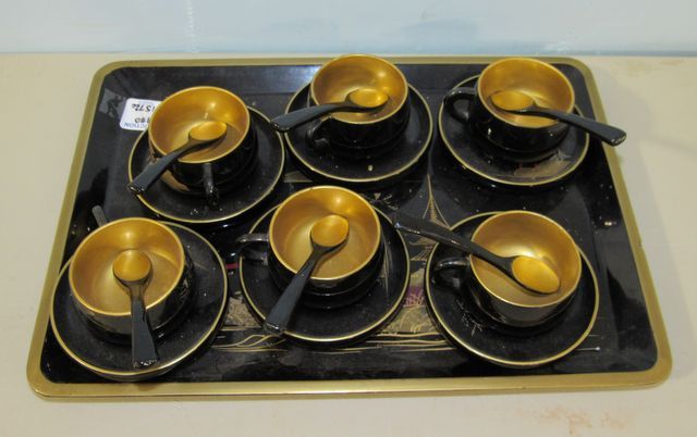 Tray and 6 cups with spoons, plastic. tray is 13"w., 9"d. Tray and 6 cups with spoons, plastic. tray is 13"w., 9"d.