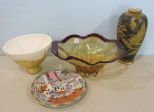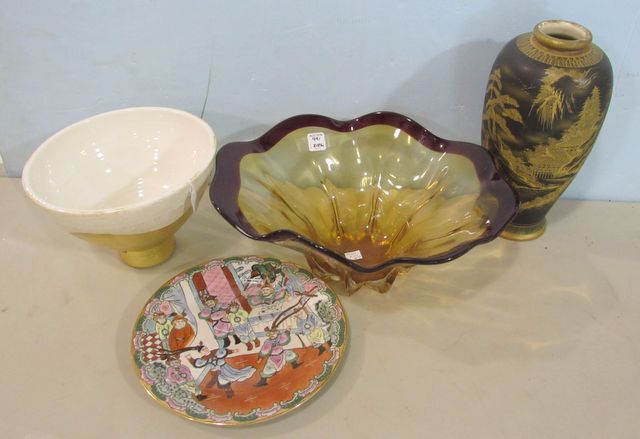 991 Green Glass Centerpiece, Satsuma Vase, Two Tone White and Gold Bowl, Asian Plate