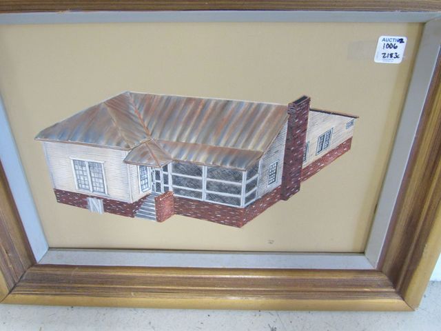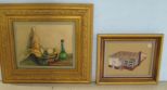 1006 Gold Framed Watercolor of Fruit and Painting of House signed Ann 1980