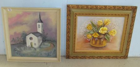 Signed Ann 1980 Flowers in Planter 16" x 19", Signed Lou Eckert Church 16" x 16" Signed Ann 1980 Flowers in Planter 16" x 19", Signed Lou Eckert Church 16" x 16"