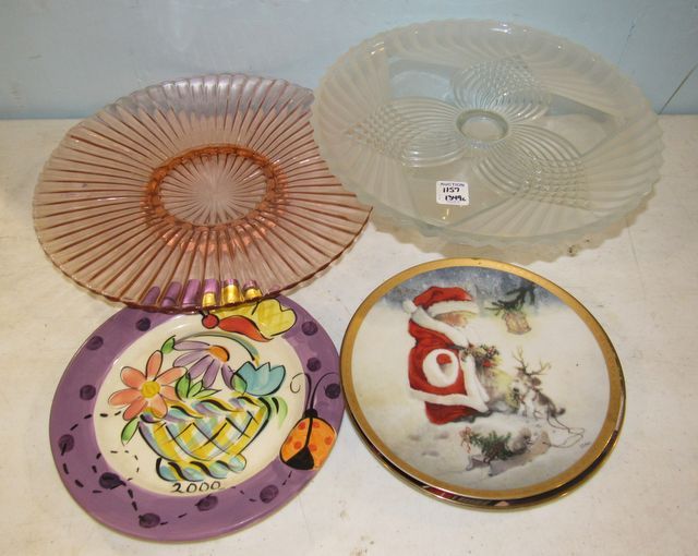 1157 Two Glass Serving Pieces and Three Collectors Plates