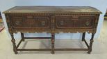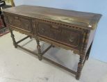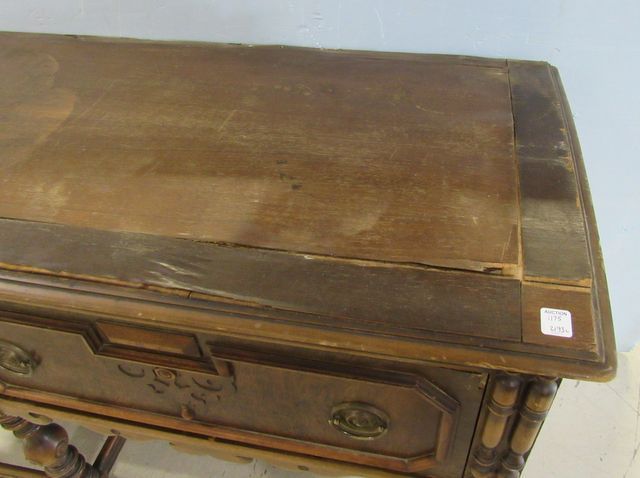 Rough condition, damaged, missing one back stretcher, top is warped, Two drawers, 35"h., 66"w. Rough condition, damaged, missing one back stretcher, top is warped, Two drawers, 35"h., 66"w.