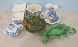 Holland Mold Pottery Leaf, Handmade Pottery Leaf Bowl, Blue and White Teapot, Four Planters, French Spice Jar, Norcrest Pitcher and Underplate. Holland Mold Pottery Leaf, Handmade Pottery Leaf Bowl, Blue and White Teapot, Four Planters, French Spice Jar, Norcrest Pitcher and Underplate.