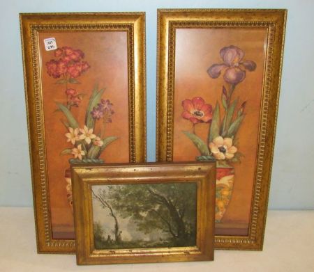 Pair of gold framed vases 11" x 23", Landscape print of board, 10" x 13" Pair of gold framed vases 11" x 23", Landscape print of board, 10" x 13"