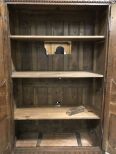 19th Century French Louis XV Style Marriage Armoire, carved trim designs, double door with key, has age wear, one piece, doors lift off hinge, crest top will come off, two new shelves, has holes in back panel for tv option, 7'10"h., 52"w., 22"d. Oak wood. 19th Century French Louis XV Style Marriage Armoire, carved trim designs, double door with key, has age wear, one piece, doors lift off hinge, crest top will come off, two new shelves, has holes in back panel for tv option, 7'10"h., 52"w., 22"d. Oak wood.