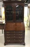 Henkel Harris Mahogany Secretary, two piece, Virginia Galleries, drop front desk, two door glass top, has key, 82"h., 38"w., 21"d. Henkel Harris Mahogany Secretary, two piece, Virginia Galleries, drop front desk, two door glass top, has key, 82"h., 38"w., 21"d.