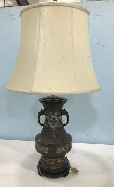 AntiquePair of Old French Chinoiserie Urn Lamp, brass and enamel, dragon handles, with shade, Japanese style, 30"h. AntiquePair of Old French Chinoiserie Urn Lamp, brass and enamel, dragon handles, with shade, Japanese style, 30"h.