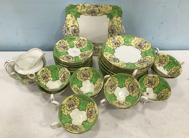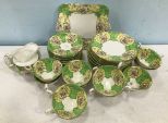Hand Painted Porcelain China Set, hand painted floral border design, good condition, 12 dessert plates, square platter, creamer, saucers, cups, bowl. Hand Painted Porcelain China Set, hand painted floral border design, good condition, 12 dessert plates, square platter, creamer, saucers, cups, bowl.