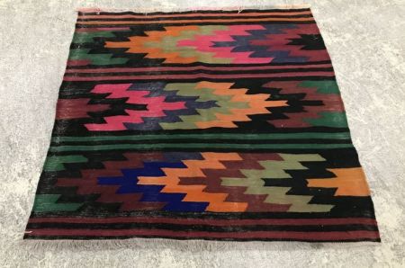 Low Pile Multi Colored Hand Woven Rug, some fading, square, 3'9 x 3'9. Colors will likely look lighter in the photograph. Low Pile Multi Colored Hand Woven Rug, some fading, square, 3'9 x 3'9. Colors will likely look lighter in the photograph.