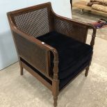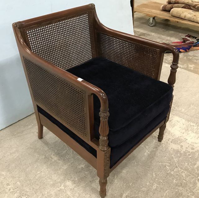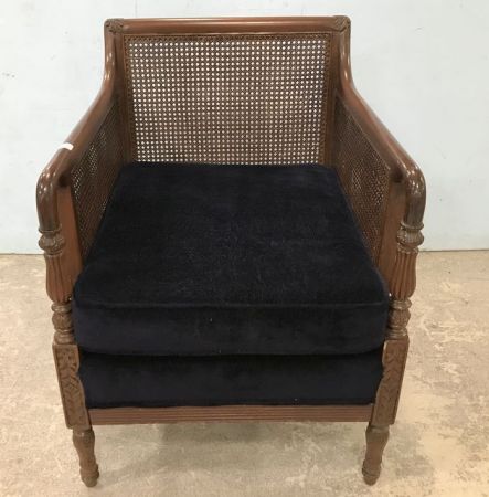 Vintage French Style Cane Arm Chair, navy blue cushions, good condition, 32"h. Vintage French Style Cane Arm Chair, navy blue cushions, good condition, 32"h.