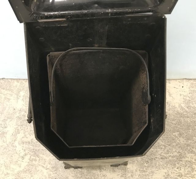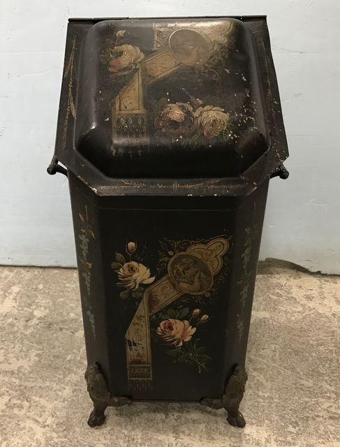 Antique Painted Tin Coal Scuttle, floral designs, lift top, handled, 26"h., 12"w. Antique Painted Tin Coal Scuttle, floral designs, lift top, handled, 26"h., 12"w.