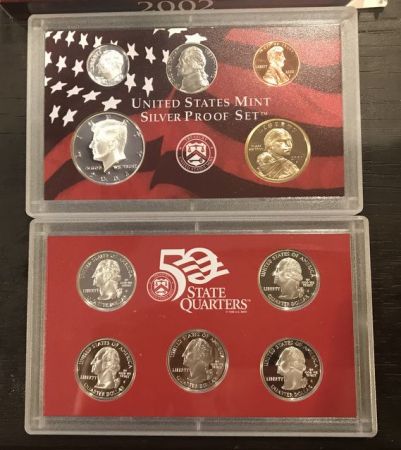 2002 United States Mint Silver Proof Set and State Quarters, Kennedy Half Dollar 90 %, Dime 90%, Nickel, Quarter 90%, cent, Five Silver State Quarters, S mark. 2002 United States Mint Silver Proof Set and State Quarters, Kennedy Half Dollar 90 %, Dime 90%, Nickel, Quarter 90%, cent, Five Silver State Quarters, S mark.