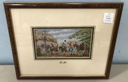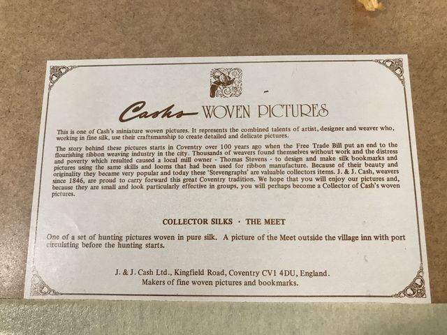 "The Meet" Cash's Woven Picture, woven silk, hunting scene, matted, framed, 9"h., 11"w. "The Meet" Cash's Woven Picture, woven silk, hunting scene, matted, framed, 9"h., 11"w.