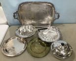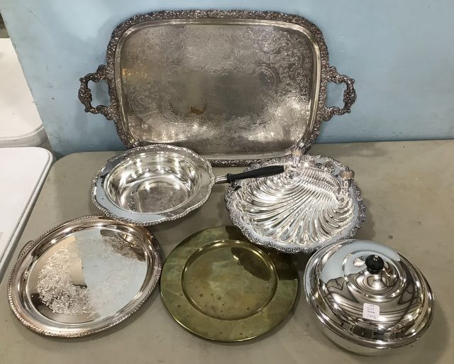 Silver plate round tray, handled pot, brass plate, Shell dish with candle sticks, covered pot, ornate silver plated handled serving tray 27"h. Silver plate round tray, handled pot, brass plate, Shell dish with candle sticks, covered pot, ornate silver plated handled serving tray 27"h.